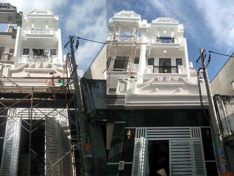 Dự án này do anh Quân làm chủ đầu tư, và có qui mô xây dựng bao gồm 1 trệt và 2 lầu với chiều ngang 4m và chiều dài 17m. Căn nhà được thiết kế và xây dựng theo phong cách tân cổ điển, màu sơn chủ đạo là tone màu trắng, toát lên vẻ trẻ trung, mặt tiền được kết hợp những họa tiết phù điêu nhỏ thể hiện sự uy nghiêm và sang trọng. Kết hợp vào đó là những điểm nhấn được tạo nên từ những bộ cửa nhôm xinfa màu đen thể hiện sự chắc chắn qua từng đường nét. Màu gạch nền được lựa chọn tone màu trắng để tạo sự hài hòa cùng màu sơn tường và giúp ngôi nhà trở nên thoáng đãng.