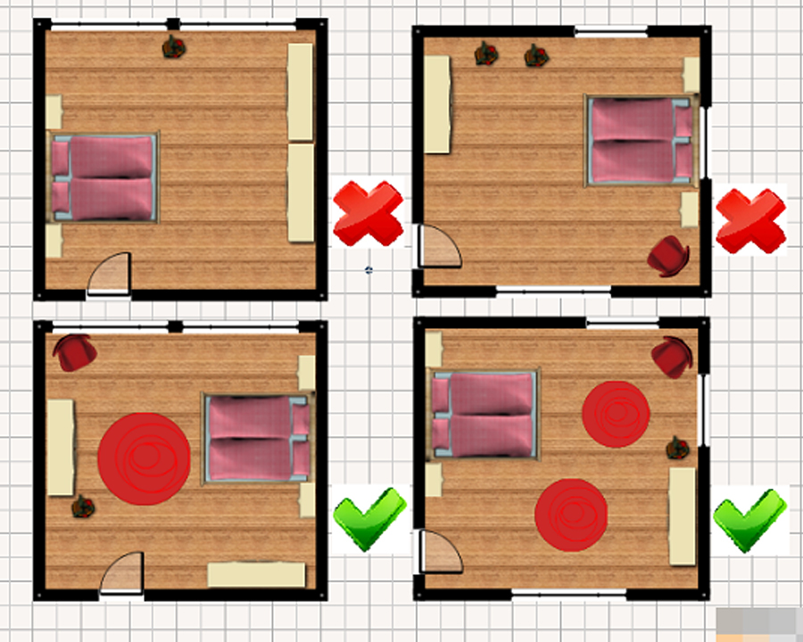 Không nên đặt giường ngủ ở chính giữa phòng, không có điểm tựa khiến cho bạn có cảm giác thênh thang, chơi vơi, bất định. Nếu đặt giường ngủ như thế sẽ gây ra sự bất tiện, cản trở việc đi lại, khó khăn trong việc bố trí nội thất trong phòng hơn. Đặt giường ngủ sát tường giúp dễ dàng hơn trong việc trang trí nội thất ngăn nắp, gọn gàng.